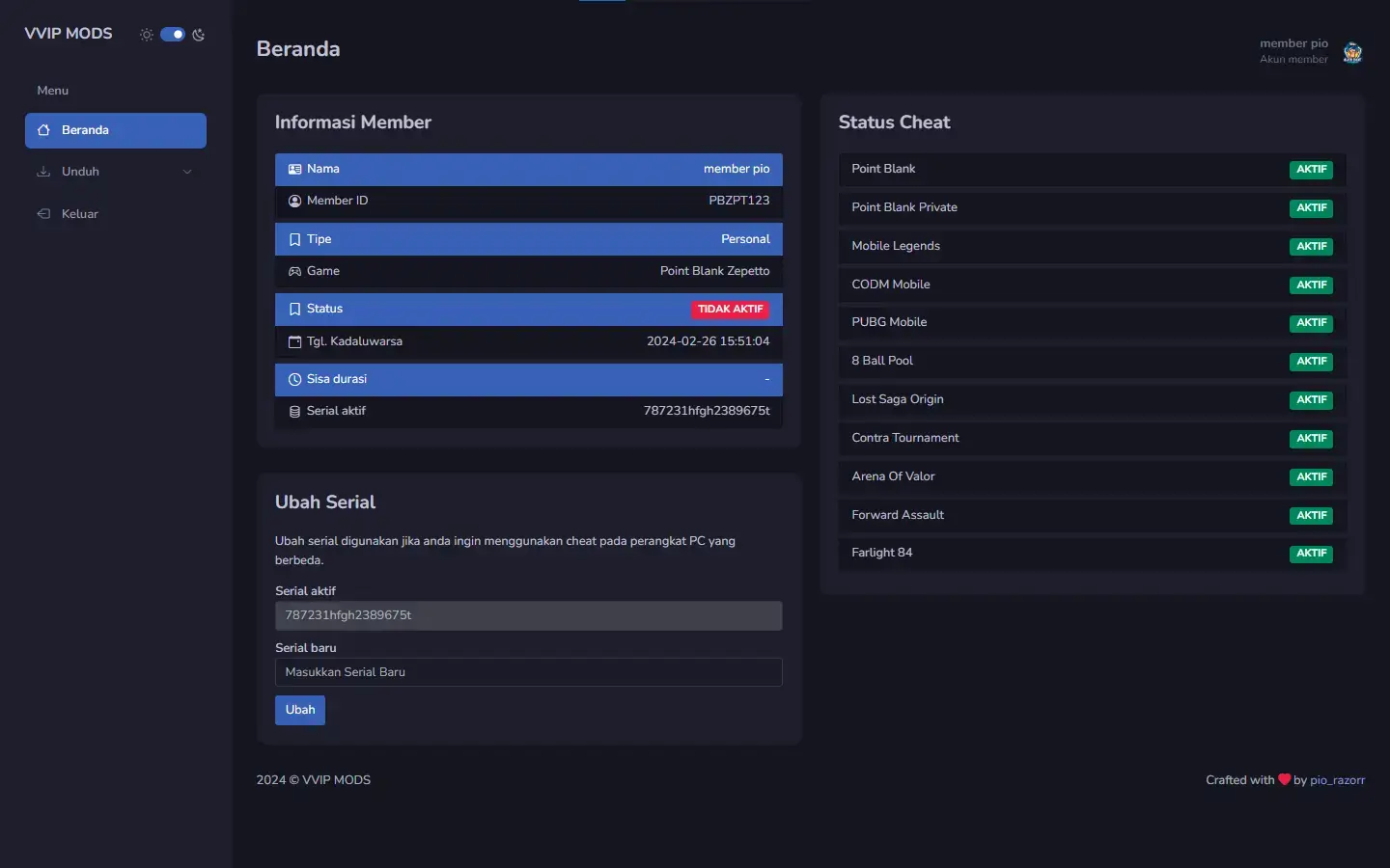 Every purchase at VVIP MODS will be given a Web Server facility for the convenience of members in downloading cheat tools, cheat support files, and especially for changing computer serials/HWID when switching PC.